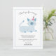 Cartão de agradecimento de festa de aniversário fofo para a festa temática de gato do seu filho. Ilustração de um gato azul com um sorriso no rosto usando um chapéu de festa. O texto acima diz "obrigado por vir!" e o texto abaixo entra em mais detalhes agradecendo ao amigo por participar do evento e pelo presente que trouxe. Você pode adicionar o nome do seu filho na parte inferior. Os textos são facilmente editáveis online.