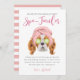 Cartão de agradecimento de papel para festa de aniversário com tema de spa fofo com ilustração de um cão Spaniel King Charles sendo mimado com uma faixa de cabeça rosa e pepinos nos olhos. O texto no topo diz "obrigada por tornar minha festa no spa espetacular". O texto padrão agradece aos convidados pela celebração e pelo presente. Este design rosa é ótimo para uma festa de meninas.