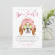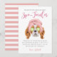Cartão de agradecimento de papel para festa de aniversário com tema de spa fofo com ilustração de um cão Spaniel Charles King sendo mimado com uma faixa de cabeça rosa e pepinos nos olhos. O texto no topo diz "obrigada por tornar minha festa spa-tacular". O texto padrão agradece os convidados pela celebração e pelo presente. Este design rosa é ótimo para uma festa de menina.