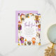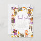 Este design fofo apresenta uma borda pintada à mão ou personagens divertidos de Halloween, há crianças disfarçadas, gatos pretos, morcegos, abóboras sorridentes, fantasmas, um esqueleto dançante, aranhas, balões, estrelas, poções mágicas, uma caveira com olhos de coração, uma vassoura voadora, doces de milho e muito mais! A paleta de cores é uma combinação clássica de Halloween: laranja, roxo, cinza e preto. Um cartão de agradecimento com tema de Halloween para combinar com o nosso design de "Festa de Aniversário de Halloween da Menina da Festa à Fantasia Fofa". Navegue pela coleção vinculada nesta página para encontrar itens correspondentes ou visite nossa loja para mais designs de festa de aniversário de Halloween.