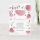 Convite de 1º aniversário para menina rosa de melancia fofa e bonita. O design apresenta melancias em aquarela, bandeirinhas de festa temáticas de melancia, coração de melancia, sementes de melancia, "uma em um melão!" e uma fatia de melancia sorridente em aquarela. Nossa doce menina é uma em um melão!