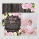 Cartão de agradecimento de festa de aniversário botânico rústico e elegante! Há uma coroa floral rosa e creme (camélia e magnólia) pintada com aquarela em um fundo de madeira. A mensagem padrão já está lá, mas é editável. Personalize este produto adicionando o nome da sua filha na parte inferior e sua própria foto.
