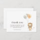 Caracteriza um leão adorável com três balões coloridos em um design limpo e minimalista. Perfeito para aniversários de crianças, combina tons pastéis suaves oferecendo amplo espaço para personalizar sua gratidão. Este cartão encantador adiciona um toque lúdico e carinhoso às suas notas de agradecimento, tornando-o um mimo delicioso para familiares e amigos.