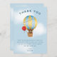 Modelo de cartão de agradecimento de festa de aniversário infantil com tema de aventura fofo com uma ilustração de um ursinho de pelúcia andando de balão de ar quente azul e amarelo com bandeiras de brilho dourado falso. A mensagem agradece aos convidados por comparecerem à festa e pelo presente. Ótimo para a festa de um menino.