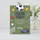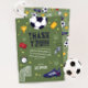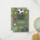 Este agradecimento de aniversário infantil com tema desportivo moderno e fixe apresenta uma ilustração desportiva de futebol verde, com uma bola de futebol, temporizador, baliza, troféu e estrelas. O cartão pode ser personalizado com o nome do seu menino e mensagem de agradecimento.