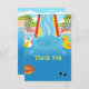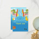 Faça um grande splash após uma festa de aniversário infantil realizada em um parque aquático, clube de natação ou área de respingos com este cartão de agradecimento. Água desce por um tobogã amarelo brilhante para cair em uma piscina azul brilhante cheia de boias e diversão em um dia de verão. Adicione o quanto ou pouco texto desejar em ambos os lados do cartão. Disponível com produtos correspondentes.