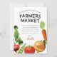 Cartão de agradecimento de festa de aniversário infantil tema legumes da feira de produtores com ilustrações desenhadas à mão de couve-flor, cenoura, cebola, tomate, ervilha, beterraba. A mensagem agradece aos convidados por comparecerem à festa e pelo presente. Ótimo para festa de menina.