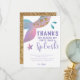 Modelo de cartão de agradecimento de tema infantil mágico e caprichoso Submarino para festa de aniversário, apresentando uma cauda de sereia em cores rosa, roxo e azul turquesa com escamas de brilho dourado falso. O texto diz "obrigado por fazer da minha festa um grande sucesso". A mensagem padrão diz "obrigado por celebrar comigo". Personalize este produto adicionando o nome da sua filha no final. Ótimo para o aniversário de uma menina.