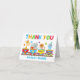 Esses cartões de agradecimento de trem de animais de circo adoráveis apresentam animais do zoológico em uma safari. O trem contém uma girafa, elefante, tigre e um hipopótamo fofo acima do monograma de seus filhos escrito sob cores laranja, verde, vermelho e azul legais.