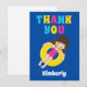 Cartão de agradecimento para festa de piscina infantil incrível para uma criança morena no time de natação durante o verão. Apresenta uma explosão de cores brilhantes e divertidas e uma menina nadadora adorável em um tubo interno.