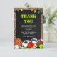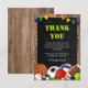 Esses cartões de agradecimento de aniversário são um divisor de águas! Divertidos e coloridos com tema esportivo, apresentando um fundo rústico de madeira e quadro-negro preto, decorado com estrelas brancas minúsculas, uma faixa colorida, grama verde e uma variedade de equipamentos esportivos (bola de futebol, vôlei, basquete, disco de hóquei, bola de rúgbi, bola de tênis, bola de sinuca, bola de golfe e até uma bola de pingue-pongue!). O modelo moderno de agradecimento é fácil de personalizar. Para alterar a cor do texto, a fonte ou o tamanho, basta clicar em 'personalizar ainda mais'.