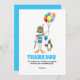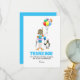 Cartão de agradecimento para uma festa de aniversário na piscina. É adequado para crianças e tem uma ilustração divertida com uma menina e um pinguim que estão prontos para a festa.