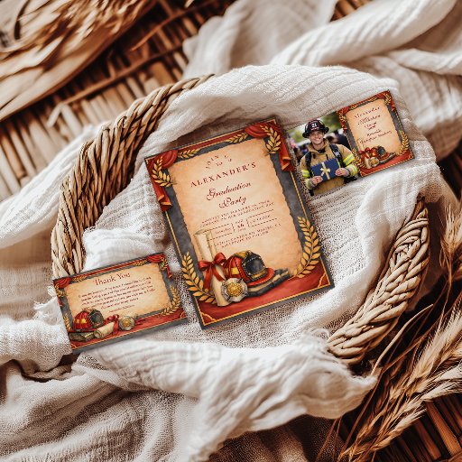 A bold firefighter graduation design featuring classic ceremonial elements, rich red and charcoal tones, and a traditional laurel frame symbolizing achievement and service. The illustrated helmet, turnout gear, and badge create a proud, respectful look perfect for honoring a firefighter’s milestone moment. Ideal for academy graduations, promotions, and first responder celebrations with a timeless, dignified style.