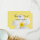 Um design floral suave e delicado com uma flor de Plumeria havaiana branca e amarela sobre um fundo amarelo. Um conjunto de convites perfeito para casamento na praia, casamento havaiano, casamento em destino de ilha tropical e mais. O significado havaiano para a flor de Plumeria é "novos começos" e "positividade". Ambos perfeitos para os novos começos de um relacionamento casado.