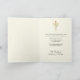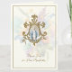 Com uma bela Cruz Mariana dourada e a Virgem Maria com um buquê de flores ao fundo. Dentro também há uma cruz dourada com lírios e um lindo sentimento de agradecimento.