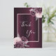 Um fundo burgundy profundo, decorado com florais robustos e cor-de-rosa.Na frente, um roteiro com letras grandes e o texto: Obrigado. Voltar: Personalize e adicione sua nota de agradecimento e seu nome.