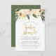 Este cartões de agradecimentos plano apresenta "chá de fraldas" em um script dourado escovado acima de uma mensagem de obrigado personalizada. Há um quadro de flores rosa pinceladas e pintadas manualmente e confete dourado. Estas cartas invertem para uma bela cor verde com um simples padrão branco.