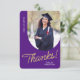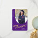 Este cartões de agradecimentos de formando plano apresenta uma foto vertical com uma borda arqueada. Personalize esta placa roxa e dourada com a sua própria mensagem ou use a que aparece.