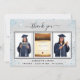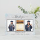 Adicione 3 das suas fotos, tamanho vertical, uma data, nome e a nota de agradecimento. Um fundo com aspecto fino prateado, decorado com faíscas azuis-claras. O texto: Obrigado na parte frontal e seu nome no verso é escrito com um roteiro à mão com na moda com baloiços.