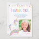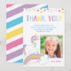 Cartão de agradecimento de aniversário de unicórnio fofo. Este design divertido apresenta uma ilustração de unicórnio doce, estrelas e um arco-íris. Cores rosa, roxo, azul e amarelo com um toque de brilho dourado falso. FOTO DE AMOSTRA DA MENINA NÃO INCLUÍDA. SUBSTITUA PELA SUA PRÓPRIA FOTO ANTES DE COMPRAR.