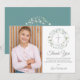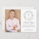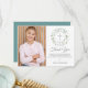 Uma coroa de louro decorativa, anéis de prata e cruz estão acima da sua mensagem especial de agradecimento da primeira comunhão e ao lado da sua própria foto neste design elegante.