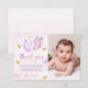 Cartão de agradecimento de foto de primeiro aniversário de menina rosa roxa borboleta dourada.