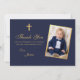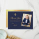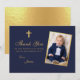 Um simples, mas elegante cartão de agradecimento de batismo. No lado direito, há uma foto inclinada em uma moldura de falso ouro. No esquerdo, sob uma cruz de falso ouro, o texto é escrito em letras douradas, com as palavras Thank You e a assinatura em uma elegante fonte caligráfica. O fundo é azul-marinho, a parte de trás é folha de falso ouro.