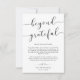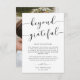 Obrigado de casamento moderno e elegante, sua carta de modelo de dois lados com um texto de tipografia que diz "além de grata" no topo. Este guião manuscrito e o espaço branco dão uma sensação simples e minimalista. A mensagem padrão abaixo da tipografia é editável. Pode ser adicionada uma imagem na parte traseira da placa.