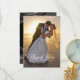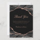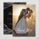 Obrigado seus hóspedes por ajudá-lo a celebrar seu dia especial com este design simples e elegante que mostra sua foto com o moderno roteiro, tons clássicos de preto, branco e cinza agata com veias metálicas de folha de ouro rosa. Personalize-o com sua foto, nomes e data de casamento na frente, junto com sua mensagem e nomes no verso.