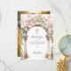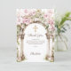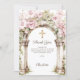 Adicione uma foto de tamanho vertical no verso. Um arco de mármore antigo com flores rosa e uma cruz dourada. Personalize e adicione um nome e nota de agradecimento.