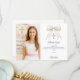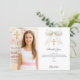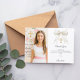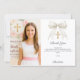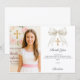 Adicione uma foto de tamanho vertical. Um laço branco com pérolas e uma cruz dourada como decoração. Personalize e adicione um nome e uma nota de agradecimento.