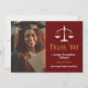 O formando da Faculdade de Direito Elegante agradece as cartas com as escalas de justiça ao lado da sua foto de formatura. Personalize esses cartões de advogado de obrigados com ouro-chic e roteiro branco ao lado da fotografia do advogado.