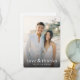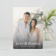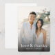 Esses cartões de agradecimento de casamento apresentam um design caloroso e romântico com uma fotografia central de dois indivíduos vestidos formalmente contra um cenário externo suavemente desfocado. A paleta de cores é dominada por tons neutros como bege e cinza claro, complementados por toques de verde e azul, criando uma atmosfera serena. A tipografia cursiva elegante lê "amor & agradecimento", enquanto os nomes são exibidos em fonte sans-serif maiúscula e limpa, adicionando clareza e sofisticação. O clima geral é alegre e sincero, perfeito para expressar gratidão após uma celebração especial.