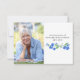 Cartões de agradecimentos funerário com foto memorial e obrigado personalizado da sua mensagem. O design apresenta um roteiro casual manuscrito e arranjos de aquarela de flores azuis que me esquecem e não. O modelo está preparado para você adicionar uma foto 'em memória amorosa' às costas com o nome de seu ente querido, assim como sua mensagem personalizada de obrigados na frente.