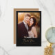Este cartão de agradecimento de casamento apresenta um design caloroso e romântico com uma fotografia central de dois indivíduos parados muito próximos, emoldurados por uma borda preta. A paleta de cores inclui luz solar dourada e tons terrosos suaves, criando uma atmosfera íntima. Uma caligrafia cursiva elegante é usada para a mensagem "Obrigado", enquanto uma fonte serifada simples fornece detalhes de localização, oferecendo uma estética sofisticada e sincera. Perfeito para expressar gratidão após uma ocasião especial, este cartão combina realismo fotográfico com tipografia estilosa para celebrar o amor e a apreciação.