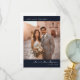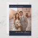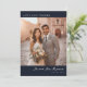 Este cartão de agradecimento de casamento apresenta um design quente e romântico com uma fotografia de um casal em frente a um antigo edifício de pedra banhado pela luz dourada do sol. O layout é equilibrado e centralizado, com amplo espaço para texto no lado direito, usando um fundo azul-marinho que contrasta lindamente com os tons suaves e convidativos da foto. A tipografia elegante inclui uma fonte moderna sem serifa no topo e um script cursivo fluído abaixo, adicionando um toque pessoal a este precioso objeto de recordação. Perfeito para expressar gratidão após o seu dia especial, este cartão captura a alegria e o calor da sua celebração.