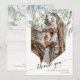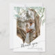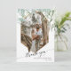 "Cartão de Agradecimento de Foto com Folhagem Dourada Rosa Geométrica Moderna Simples." Folhagem de folhas de eucalipto verde pende sobre a parte superior de uma moldura suave com brilho dourado rosa. Uma bela fonte de caligrafia, "obrigado" e seus nomes com a data do seu casamento (ou outra informação) são facilmente personalizados. No verso, há a mesma folhagem verde e um fundo de madeira de cottage branco suave que permite que você escreva à mão sua mensagem pessoal. Arte pintada e desenhada graficamente pela artista e designer licenciada internacionalmente, Audrey Jeanne Roberts, direitos autorais reservados.
