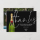 Um na moda de design moderno em preto clássico com obrigados em um grande roteiro de estilo manuscrito em branco, e uma garrafa verde de champanhe à esquerda com a tipografia que se sobrepõe levemente. Personalize facilmente o resto dos detalhes. Do outro lado, substitua a imagem de exemplo por uma das suas fotos favoritas do seu chá como um momento para os seus convidados.