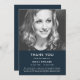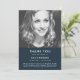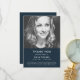 Cartões de agradecimentos funerário moderno e simples ao obrigado, no estilo moderno e minimalista do design, em azul marinho. O cartão pode ser facilmente personalizado com a sua própria fotografia e texto para criar um cartão especial na sequência do funeral, memorial ou celebração da vida do seu ente querido. A imagem mostrada é apenas para fins de ilustração para ser substituída pela sua própria foto. A imagem marcadora é de uma bela mulher com cabelo louro ondulado vestindo um topo mestiço e sendo filmada em preto e branco monocromático.