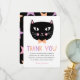 Este cartão de agradecimento fofo apresenta um gato preto desenhado à mão, com sotaques pastéis rosa e pêssego. O texto moderno lê "OBRIGADO" em roxo pastel, pêssego e rosa. Modelos de texto estão incluídos para fácil personalização. Perfeito para enviar após uma festa de aniversário temática de gato ou Halloween!