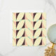 Geometric pattern with overlapping beige, peach, and brown triangles, accented by teal circles. The design forms a zigzag, creating a retro vibe.