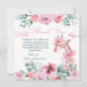 Um doce design de aquarela apresentando uma girafa encantadora cercada por flores, folhagens verdes e nuvens suaves, acentuado com fitas rosa delicadas e um laço coquete e brincalhão. A paleta pastel suave cria uma atmosfera de jardim caprichoso, perfeita para celebrações alegres de crianças e temas de festa inspirados na natureza.