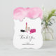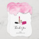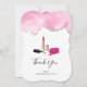Cartões de agradecimentos plano com um design de estilo de vidro. Batom rosa e esmalte. A garrafa de esmalte está aberta, deitada do lado, com uma gota de esmalte a sair. A borda superior é decorada com cor rosa com uma fina camada de brilho prateado.