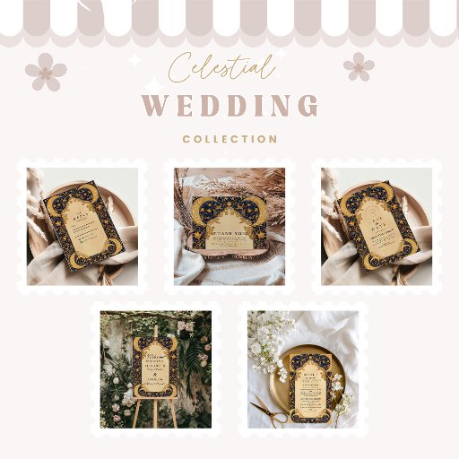 An opulent design inspired by the heavens — featuring golden crescent moons, intricate baroque scrollwork, and a rich midnight blue palette. This celestial wedding piece radiates mysticism and grandeur, perfect for couples who want a regal, otherworldly aesthetic. Ideal for cosmic, gothic, or art-inspired weddings that celebrate eternal love under the stars.