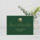 Envie um cartões de agradecimentos moderno para sua família e amigos para sua graduação. Este design ilustra um boné de formatura de ouro e um diploma à frente, com uma escrita moderna com a seguinte redação. "Amor e Obrigados" em falsa tipografia de ouro com seu nome, escola e classe/ano abaixo em um fundo verde. A parte traseira do cartão tem uma mensagem que você pode personalizar ou excluir. Desenhado pela artista ©Susan Coffey.