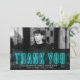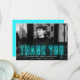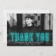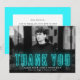 Cartões de agradecimentos de graduação moderno mostrando a foto horizontal do formando com "Obrigado" em letra de neon ciano. Personalize o cartões de agradecimentos de graduação de fotos adicionando o nome do formando, o nome da escola e o ano de graduação. O cartões de agradecimentos de fotos de graduação reverte para exibir seu obrigado digitado ou deixe o vazio para escrever seu próprio. O fundo ciano sólido pode ser mudado para uma cor de sua escolha.