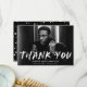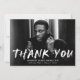 Na moda, cartões de agradecimentos de graduação moderno com a foto horizontal do formando com "Obrigado" em letras brancas com placas de pintura brancas. Personalize a frente do cartões de agradecimentos criativo adicionando o nome do formando, o nome da escola e o ano de graduação. A parte traseira do cartões de agradecimentos de fotos de graduação apresenta espaço para um obrigado digitado ou manuscrito que você envia e um plano de fundo preto e branco para pintura.