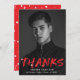 Na moda, cartões de agradecimentos de graduação moderno com a foto vertical do formando com "Obrigados" em letras vermelhas com placas brancas de tinta. Personalize a frente do cartões de agradecimentos criativo adicionando o nome do formando, o nome da escola e o ano de graduação. A parte traseira do cartões de agradecimentos de fotos de graduação apresenta espaço para um obrigado datilografado ou manuscrito que você envia e um plano de fundo vermelho e branco para pintura.
