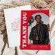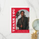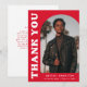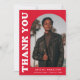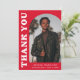 Na moda e cartões de agradecimentos de graduação de tendência apresentando a foto do formando na frente com um quadro de fotos de arco de offset. "Obrigado" é apresentado em letras a negrito e brancas com retrorreflectores sobre um fundo vermelho. Personalize a frente do cartões de agradecimentos de graduação de fotos em arco adicionando o nome do formando, a escola e o ano de graduação. A placa reverte para exibir sua mensagem digitada ou manuscrita. O cartões de agradecimentos vermelho da graduação é perfeito para formandos segundos graus e universitários.