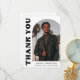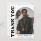 Na moda e cartões de agradecimentos de graduação de tendência apresentando a foto do formando na frente com um quadro de fotos de arco de offset. "Obrigado" é apresentado em letras negrito e preto em fundo branco. Personalize a frente do cartões de agradecimentos de graduação de fotos em arco adicionando o nome do formando, a escola e o ano de graduação. A placa reverte para exibir sua mensagem digitada ou manuscrita. O cartões de agradecimentos de graduação branco e preto é perfeito para formandos segundos graus e universitários.